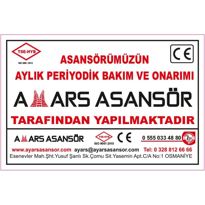 Asansör Etiketleri, bina içi güvenlik kurallarını net ve görünür şekilde aktarmak için kullanılan zorunlu uyarı ve bilgilendirme levhalarıdır. Yönetmeliklere uygun hazırlanmış bu etiketler, kullanıcıların asansör kapasitesini, kullanım talimatlarını ve acil durumda yapılması gerekenleri hızlıca fark etmesini sağlar. Dayanıklı malzeme yapısı sayesinde iç mekânda uzun süre solmadan, yıpranmadan kullanılabilir ve profesyonel bir görünüm sunar.